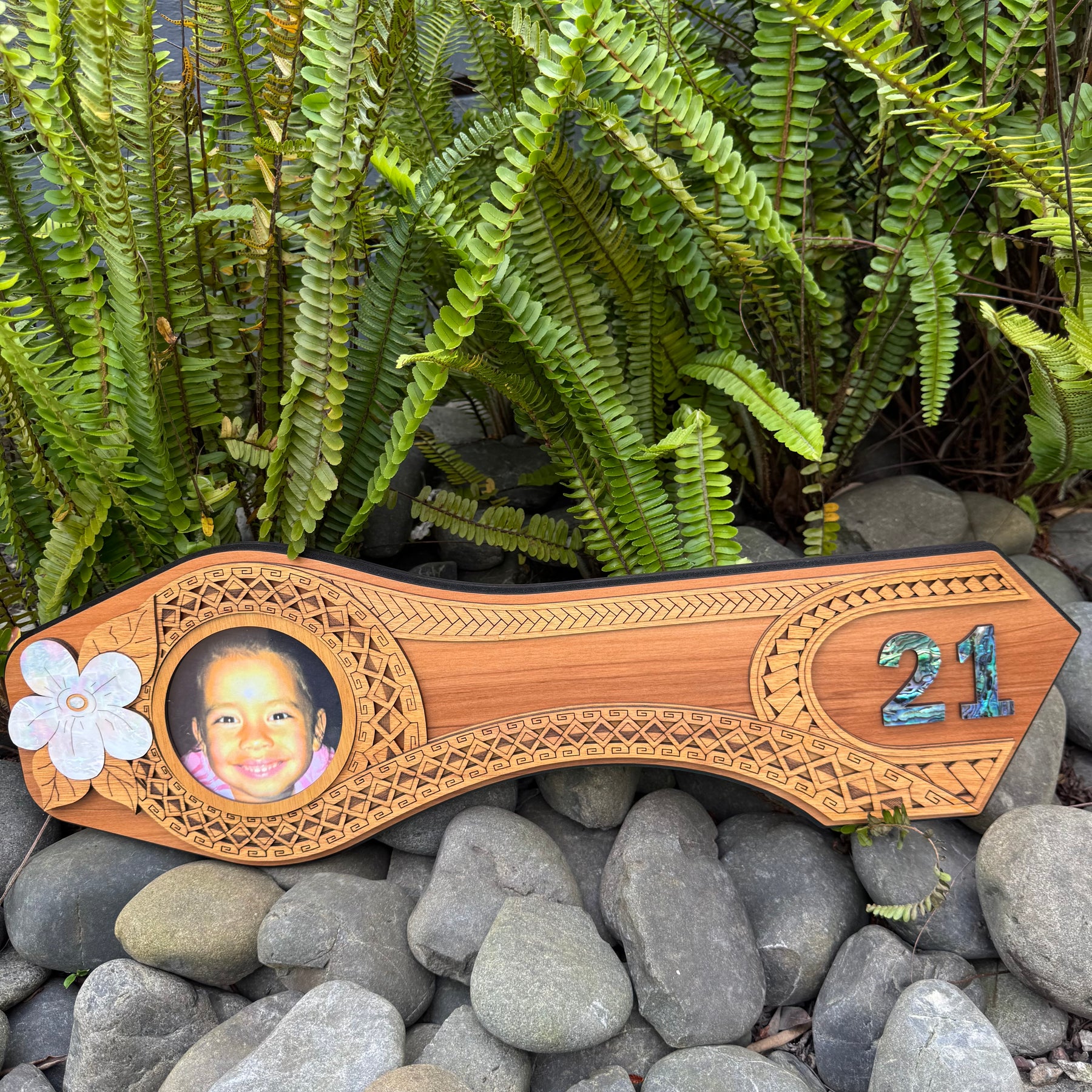 This is a contemporary artwork displaying many common Polynesian designs and artwork styles with intricate design and embellished with Mother of Pearl and Paua shell. The Polynesian 21st Celebration Key is crafted from recycled Native New Zealand Rimu veneerboard, medium density fibreboard (mdf) and Gaboon veneer plywood