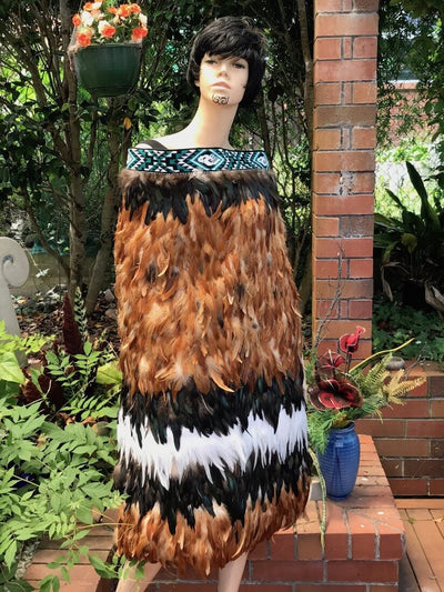 Natural, white hen with green coque colours taken from the Morepork (Ruru). These are contemporary kahu huruhuru cloaks and are real feathers double sewn on to Poplin cloth.
