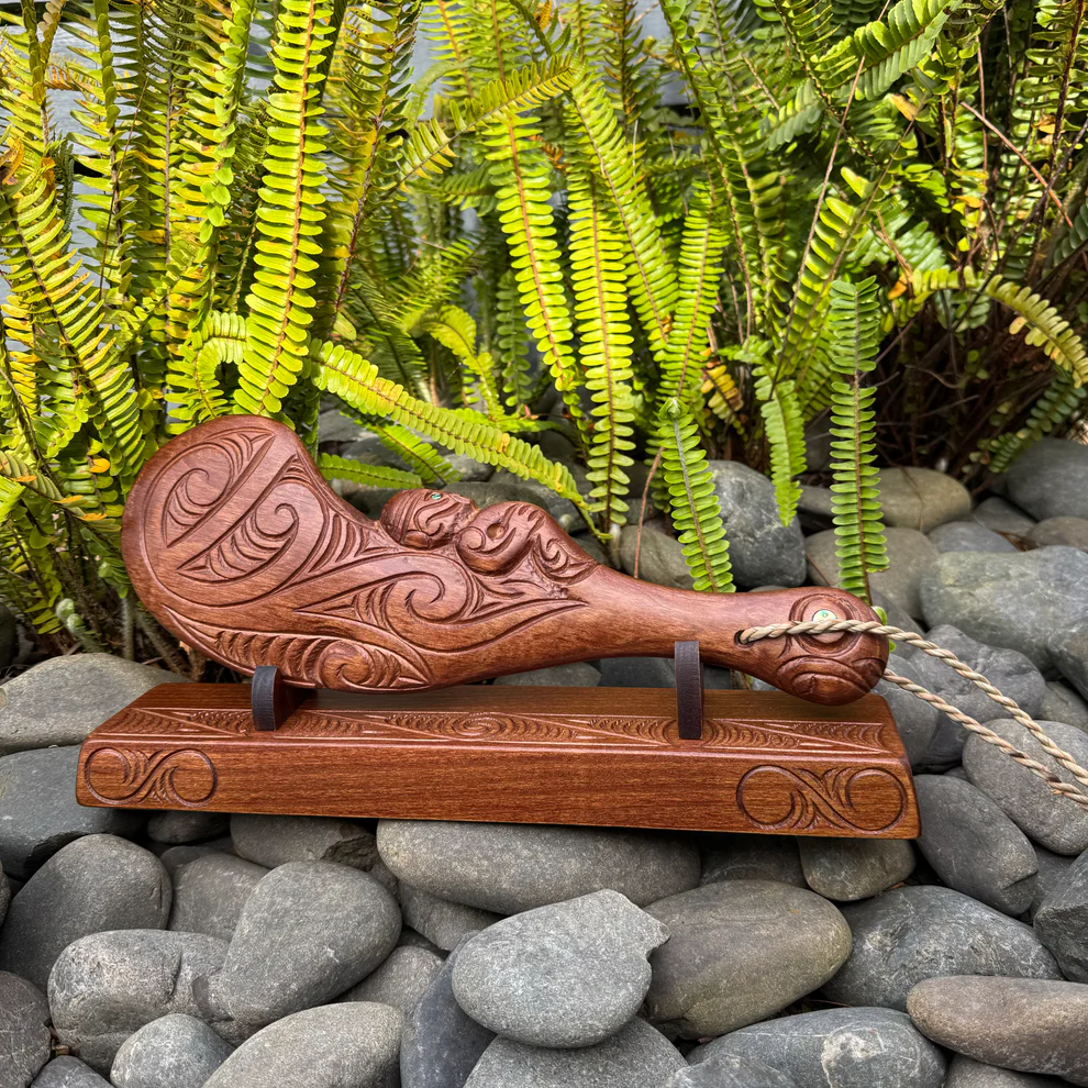 This piece has Pāua inlay set in the eyes and belongs to the Meremere or short combat weapons group. Waha-ika means the mouth of the fish. If you look at the shape of the weapon it looks like the shape of a whale's lower jaw bone. Was used where quick in-fighting action required thrusting jabs. Wahaika has two vital components. The recess used for piercing the stomach, and the figurine (guardian) to protect the user should he be attacked from behind.