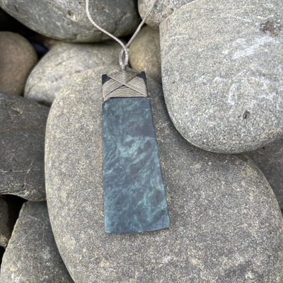 This design represents the Toki - Adze which was used as a cutting tool or carving tool. It was such an important tool in Maori life that it became regarded as a symbol of power, authority and good character. It has a Koru carved on the side representing New Beginnings.