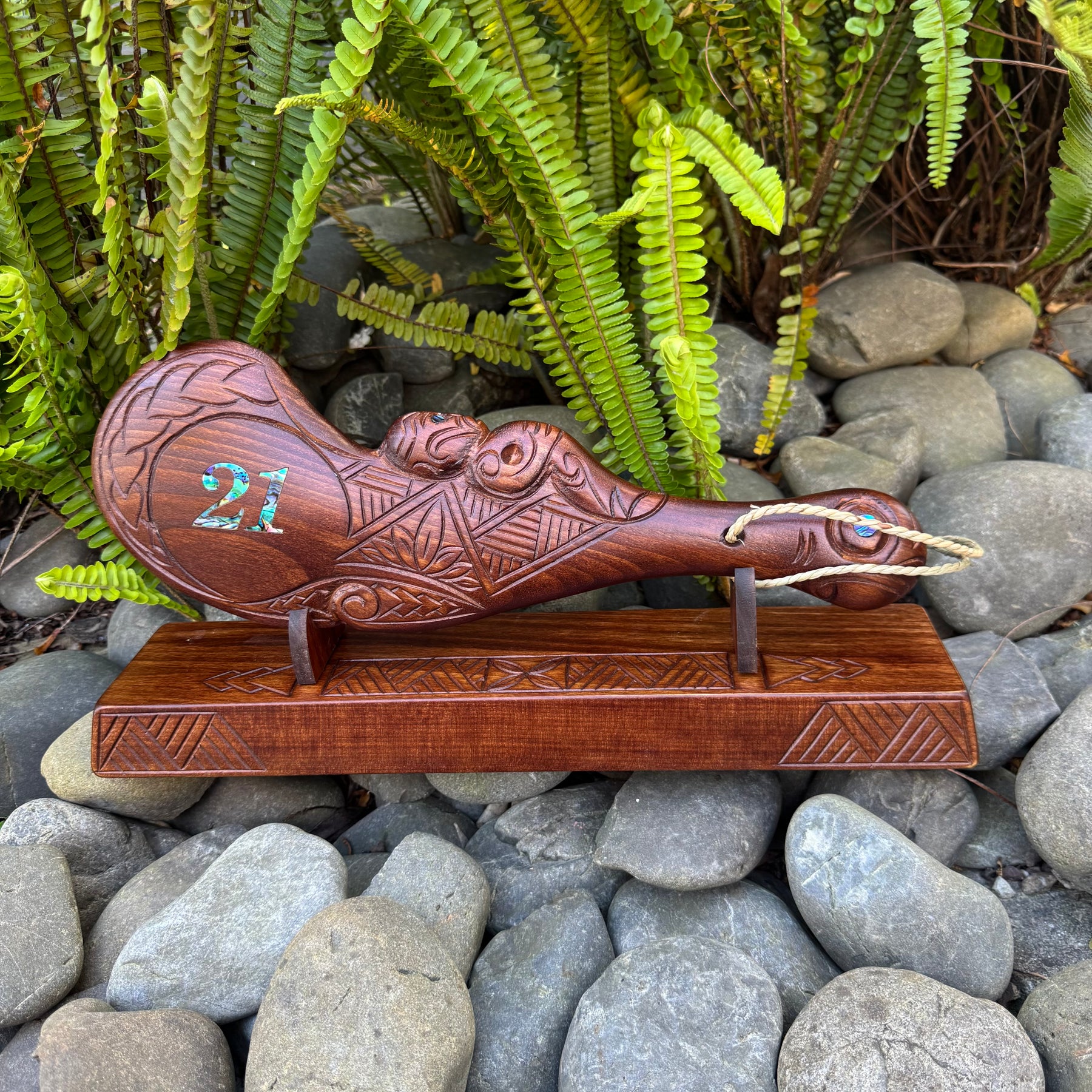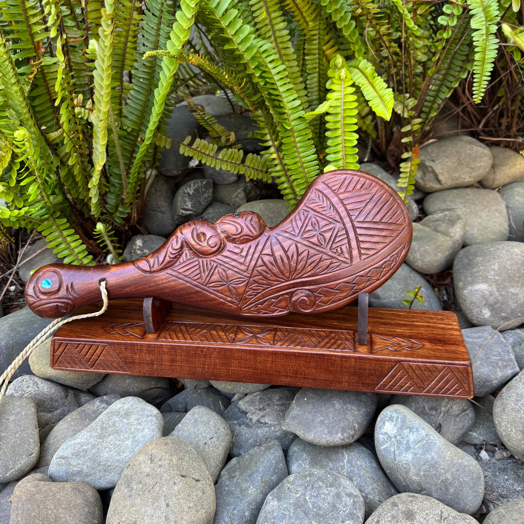 This piece has Pāua inlay set in the eyes and belongings of the Meremere or short combat weapons group. Waha-ika means the mouth of the fish. If you look at the shape of the weapon it looks like the shape of a whale's lower jaw bone. It was used where quick in-fighting action required thrusting jabs. Wahaika has two vital components. The recess is used for piercing the stomach, and the figurine (guardian) to protect the user should he be attacked from behind.