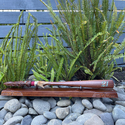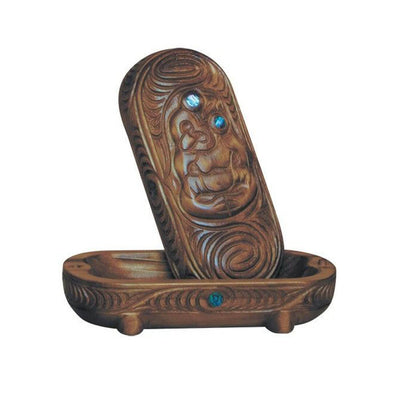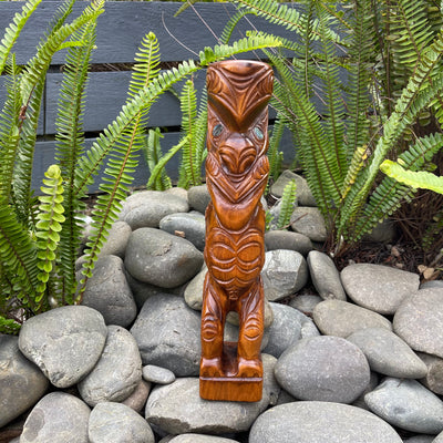 Tekoteko is the carved figure at the top of the wharenui. It represents the illustrious tūpuna (ancestors) for which the whare was named. Tekoteko are often carved in a defiant stance with a protruding tongue, and holding a mere or taiaha, to ward off intruders.